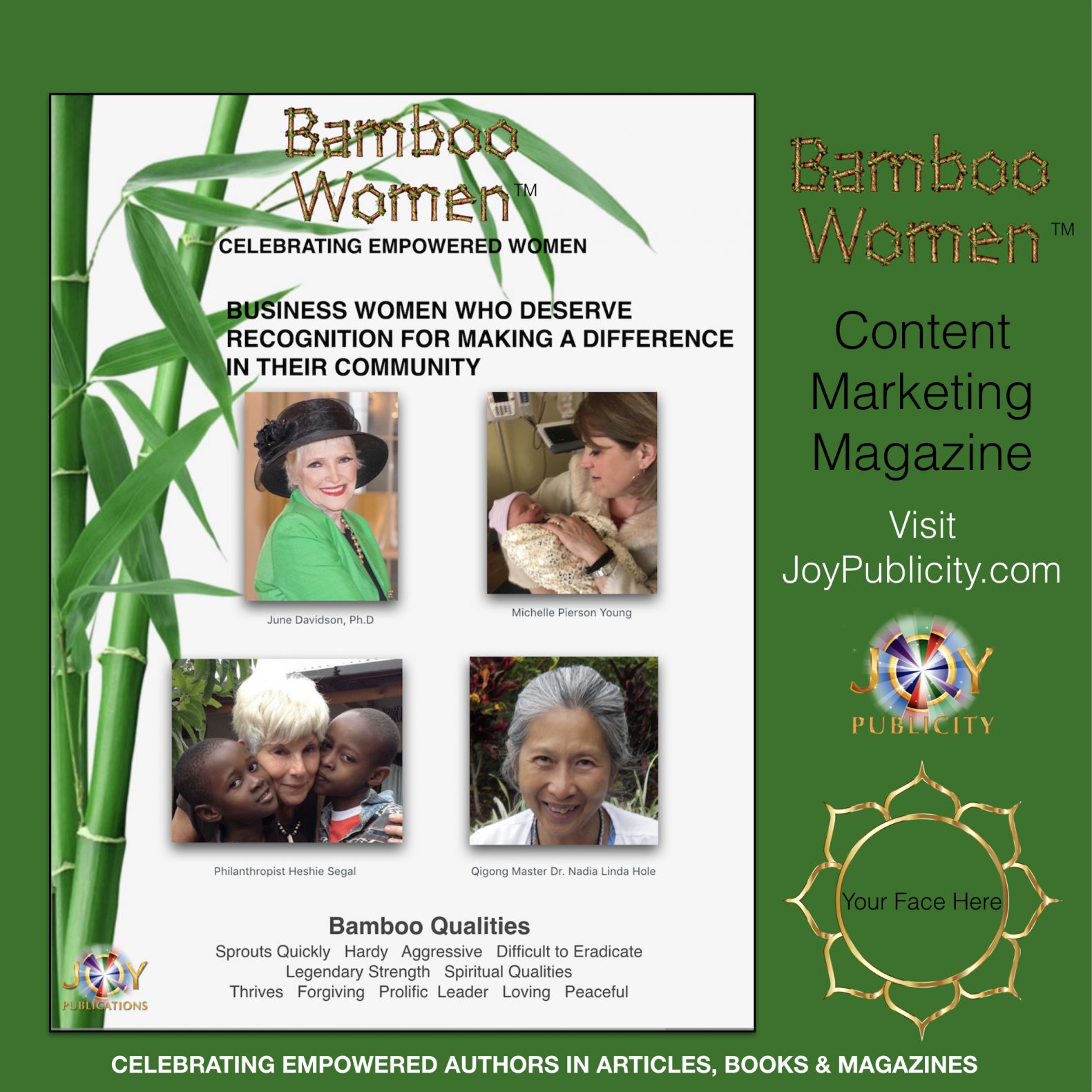 BAMBOO WOMEN MAGAZINE FEATURES WOMEN LEADERS WHO ARE MAKING A DIFFERENCE Please let us know what you think about this mock-up BAMBOO WOMEN magazine cover. Email Jeanette@joypublicity.com. Thank you! BAMBOO WOMEN MAGAZINE